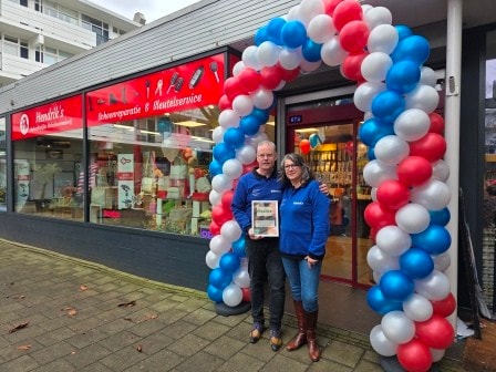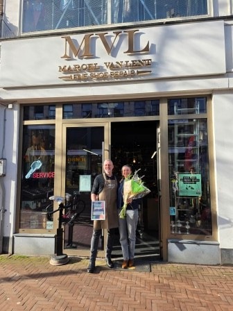 De tweede finalist, Hendrik en Janine Kooij van Hendrik’s Ambachtelijke Vakschoenmakerij eveneens in Amsterdam, hadden er een waar feest van gemaakt: een ballonnenboog bij de ingang, in de zaak ballonnen en gasten vanwege het feit dat de zaak tot de finalisten behoorde.