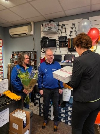 Op zaterdag 21 februari 2026 bezocht het secretariaat de drie finalisten van de Schoenmakerij van het Jaar tijdens de Felicitatietour. Alle finalisten werden persoonlijk verrast in hun zaak met een bos bloemen in de vertrouwde blauw‑groene kleuren van de vereniging, een doos verse mini gebakjes voor hun klanten en een lijst met daarin finalist van de Schoenmakerij van het Jaar 2026.